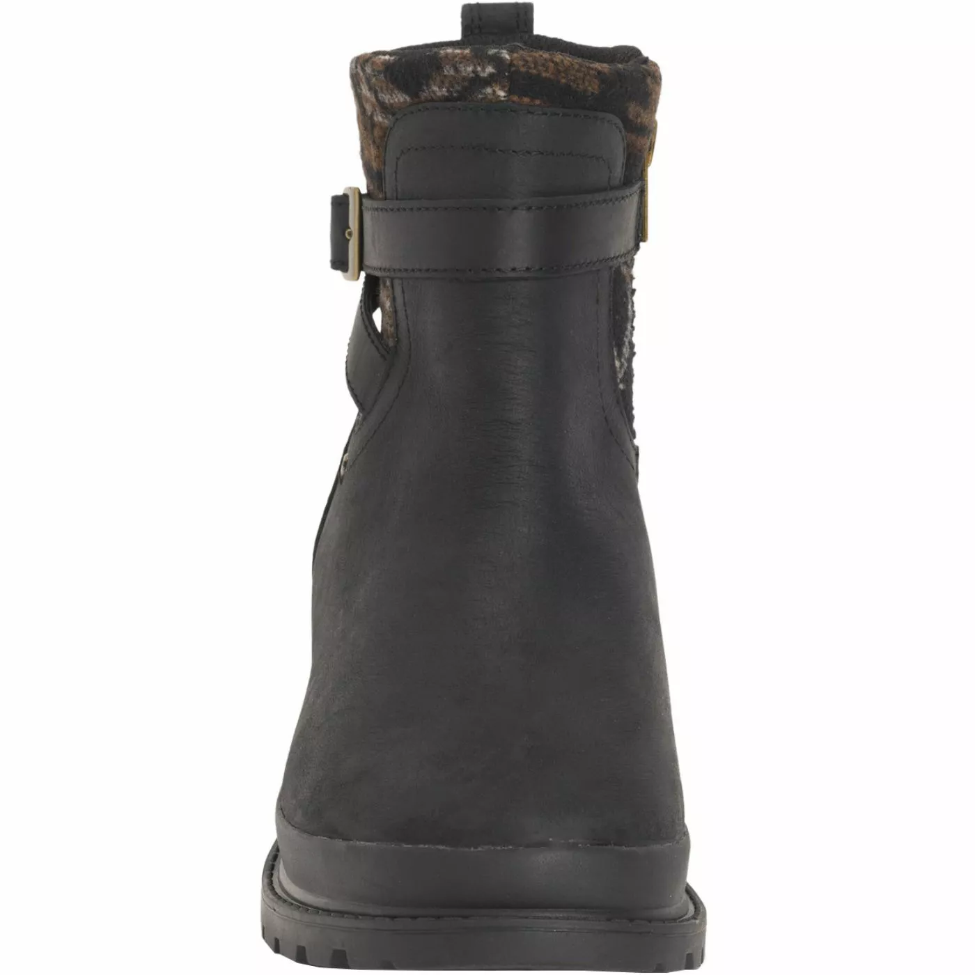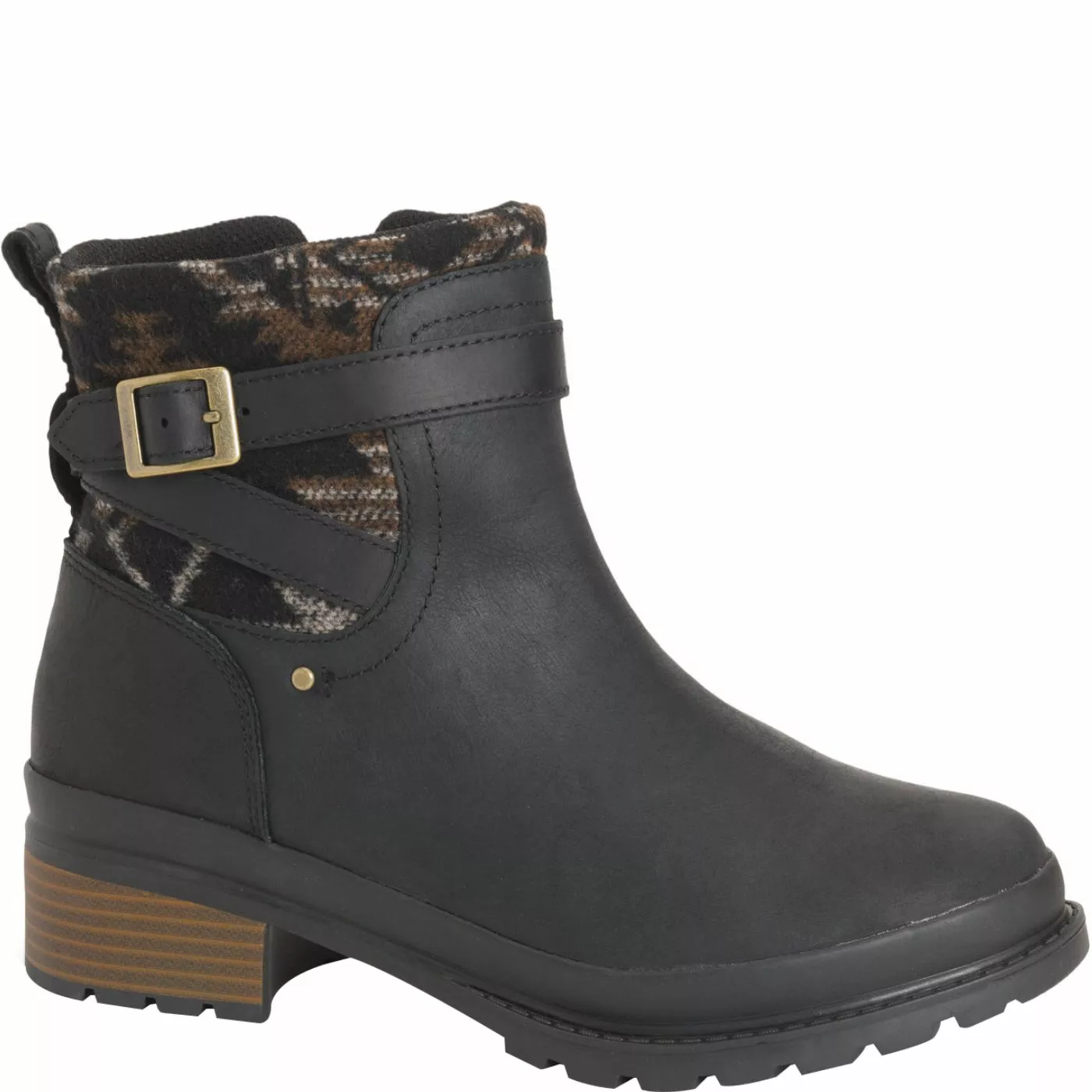 The Liberty Ankle Zip is a distressed leather ankle bootie with a buckle detail and a stacked heel for all-day styling. The exposed printed wool in horse blanket adds additional comfort and style.